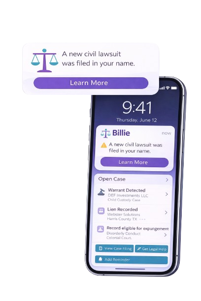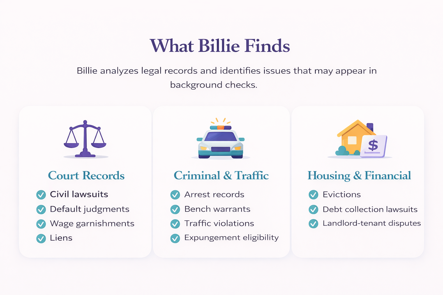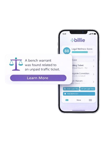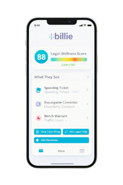 Billie analyzes public legal records to identify issues that may appear in background checks. These factors contribute to your Legal Wellness Score, a snapshot of your legal record health.