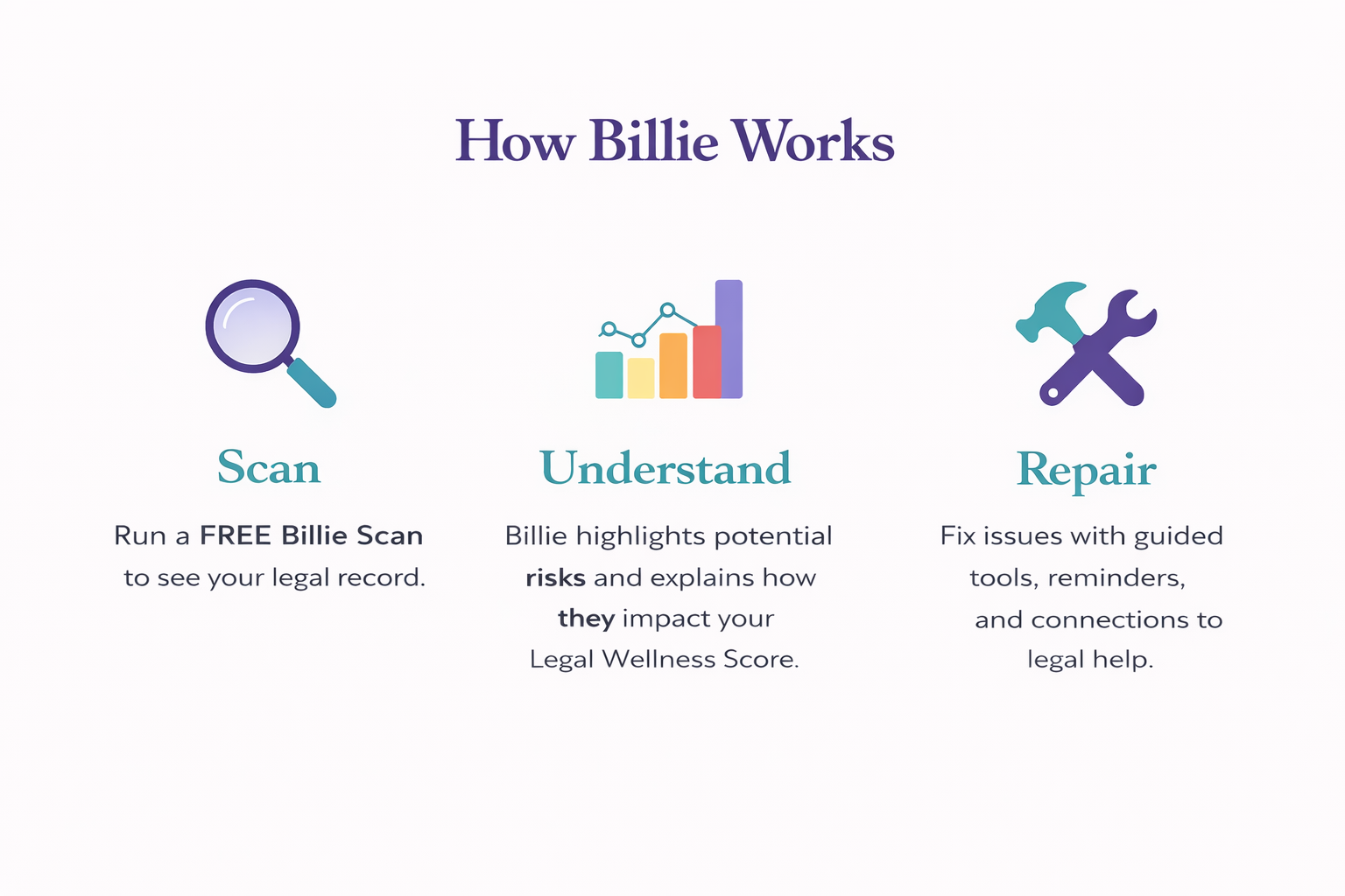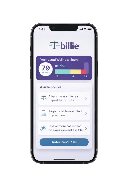 Run a FREE Billie Scan to learn what’s in your legal background check, see your Legal Wellness Score, and identify risks before they affect jobs, housing, immigration status, and other opportunities.